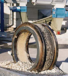 Dopo la preparazione della materia prima, il materiale è trasportato tramite una coclea alle presse. Degli appositi cilindri pressano il materiale attraverso i fori di una matrice. Dopo la pressatura I pellet caldi sono tagliati alla lunghezza desiderata e raffreddati con l’aria dell’ambiente. Poiché il legno è composto principalmente da cellulosa e lignina, tramite la pressione della fase di pressatura la lignina presente fa da collante rivestendo le fibre di cellulosa: la pellettizzazione può avvenire così senza l’aggiunta di collanti. La resistenza all’abrasione dei pellet è assicurata dall’aggiunta di sostanze che ne facilitano la pressatura, come amido e farina. Quest’aggiunta naturale è permessa fino a un valore massimo del 2%, anche se di regola però non si usa più dello 0,5%.